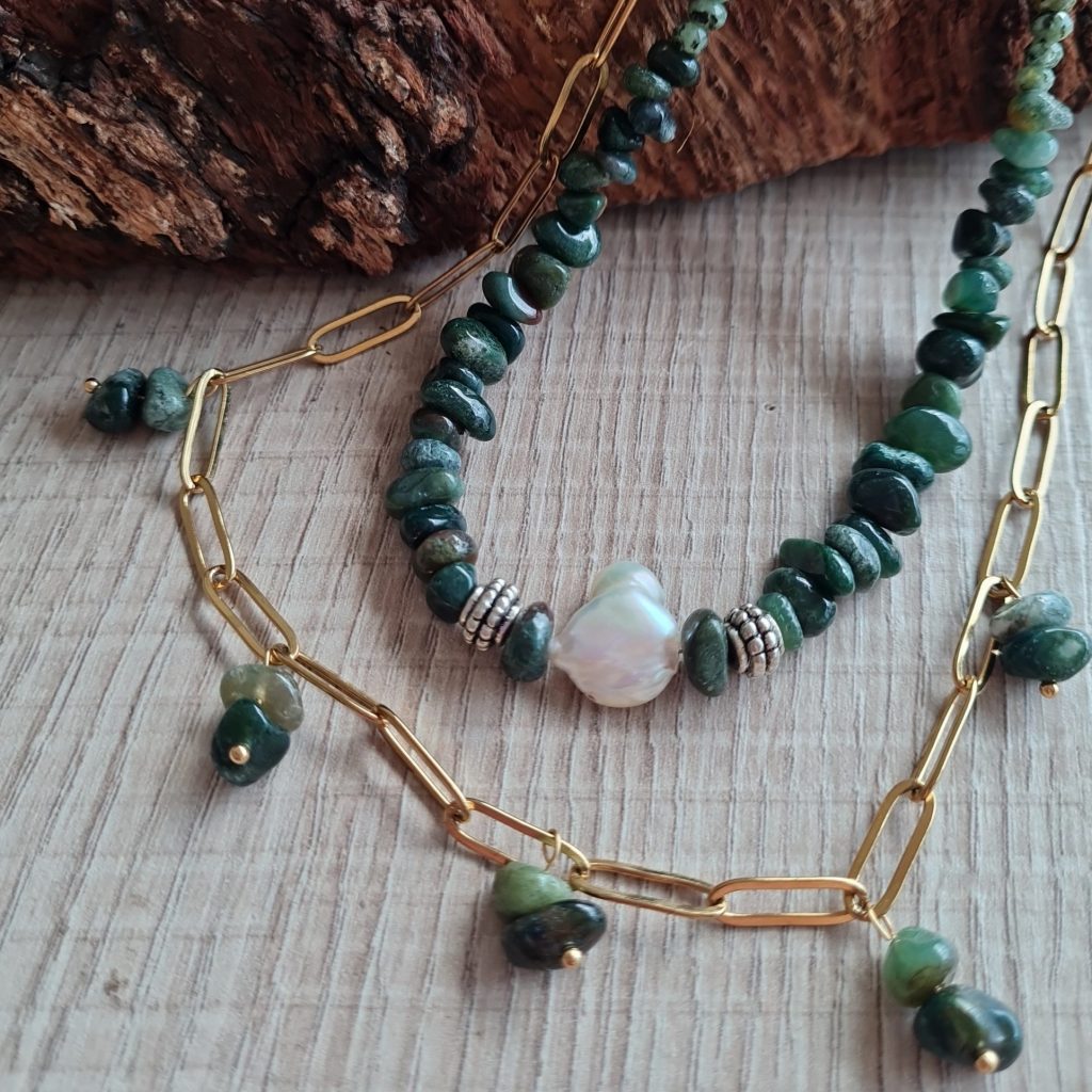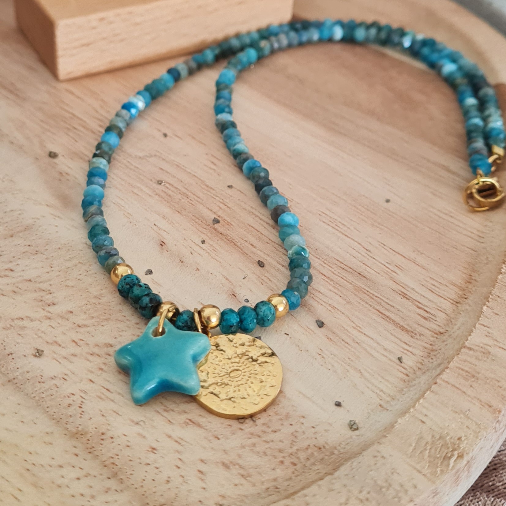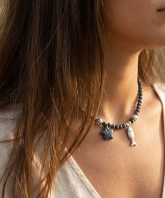 Océano es una colección de collares artesanales elaborados con piedras naturales, inspirados en el mar, sus paisajes y sus ritmos. Diseños donde el color, la textura y la materia evocan calma, profundidad y movimiento.