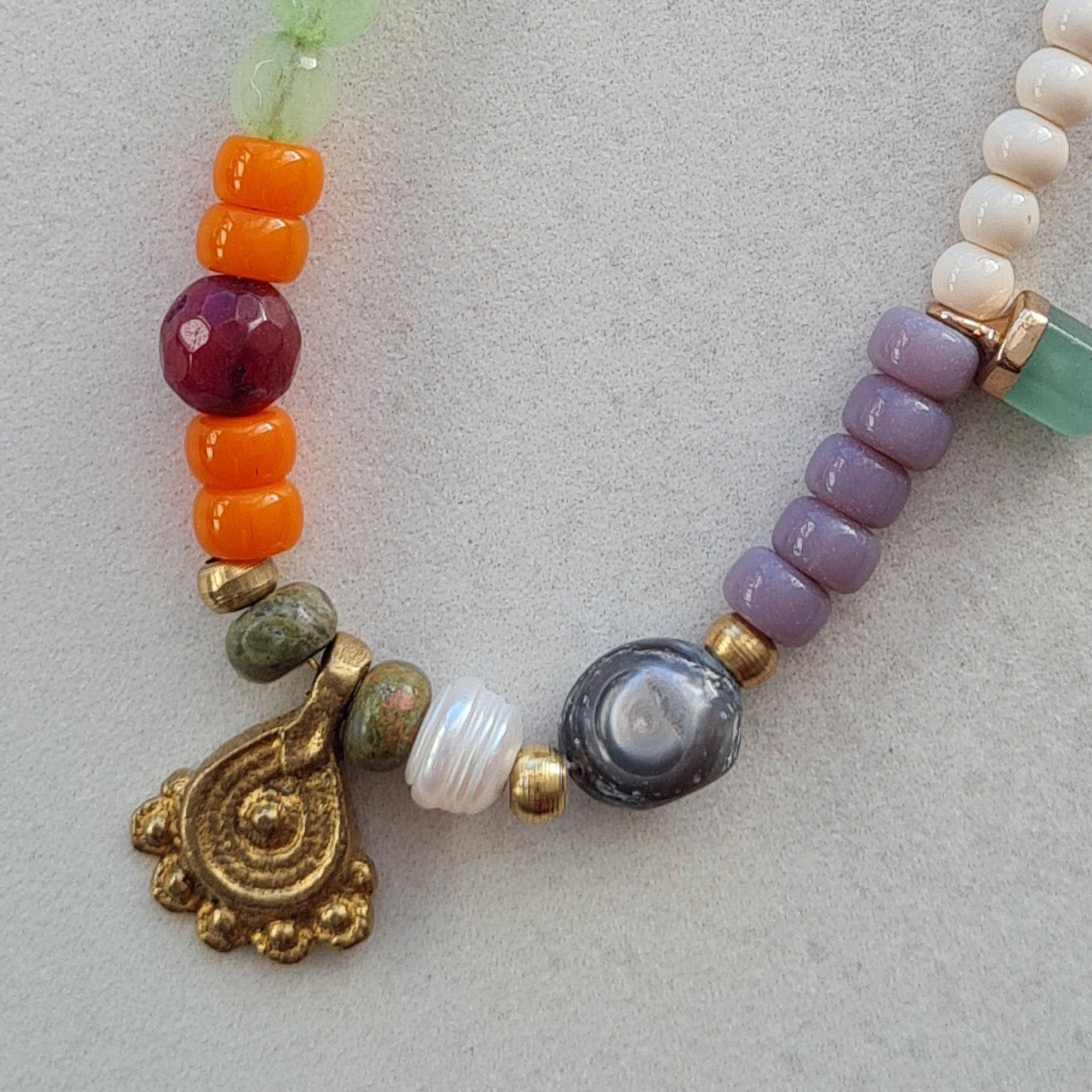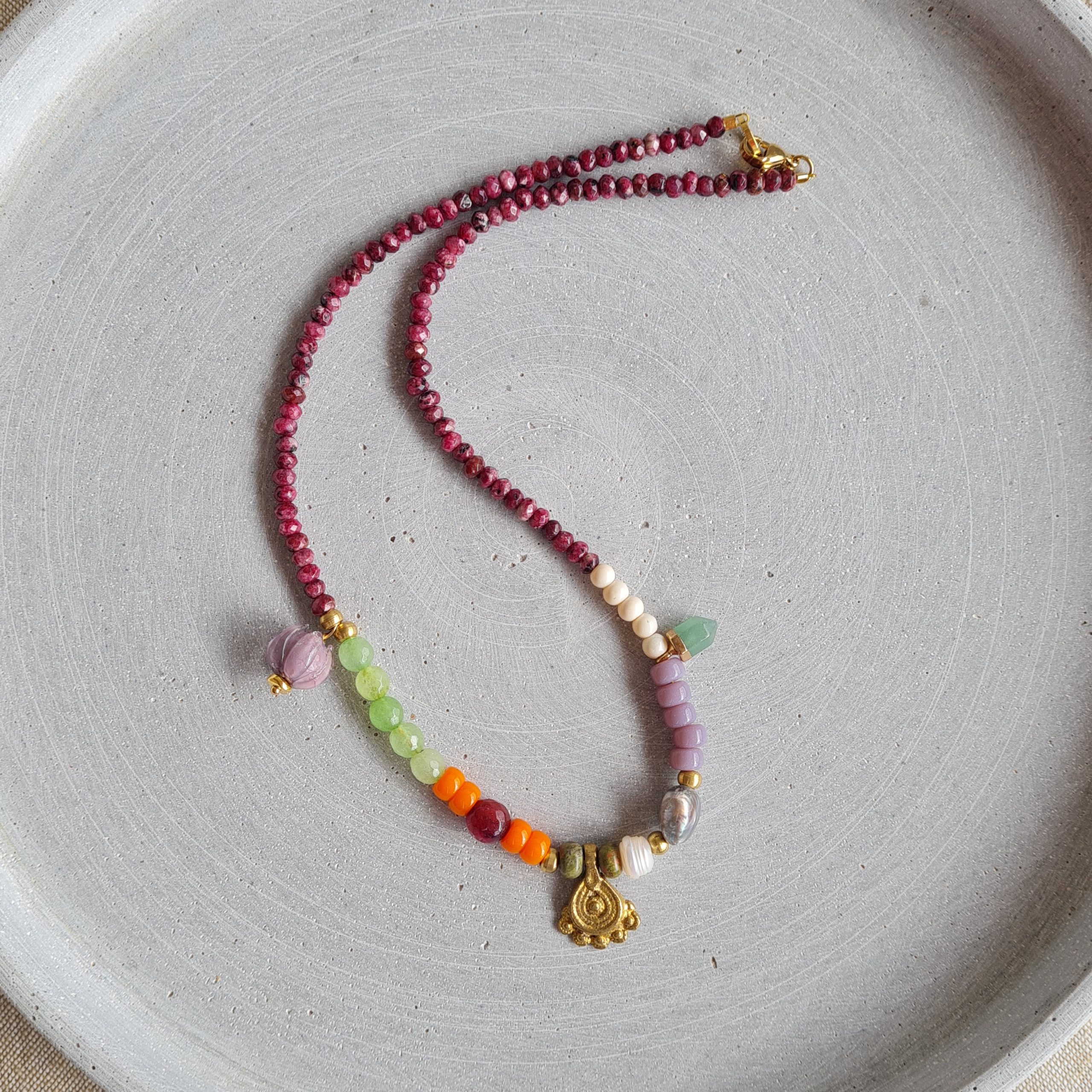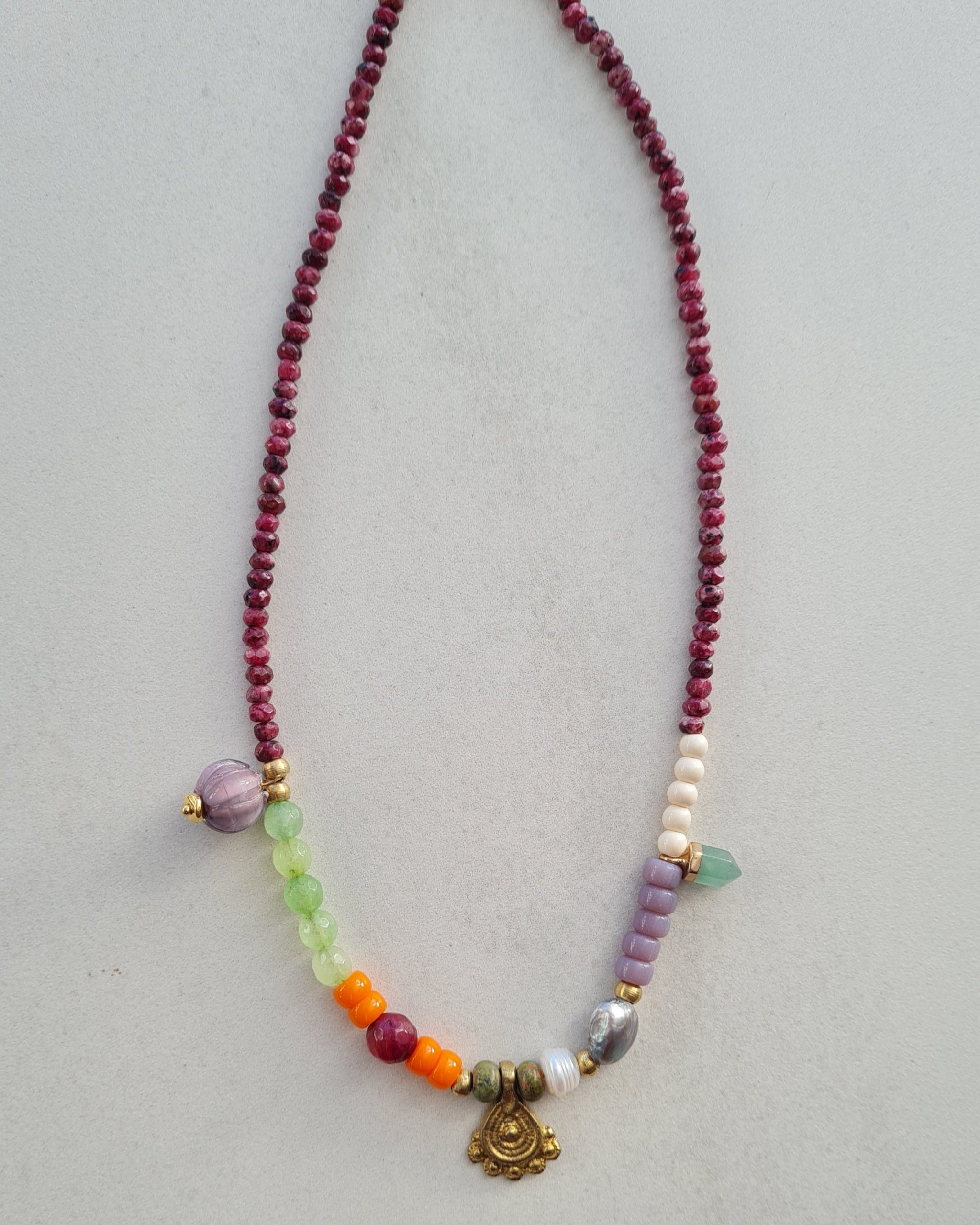 Collar artesanal de la colección Nepal elaborado con una cuidada mezcla de piedras naturales y colgante dorado de inspiración étnica. Cada pieza está montada a mano, buscando el equilibrio entre color, textura y forma.