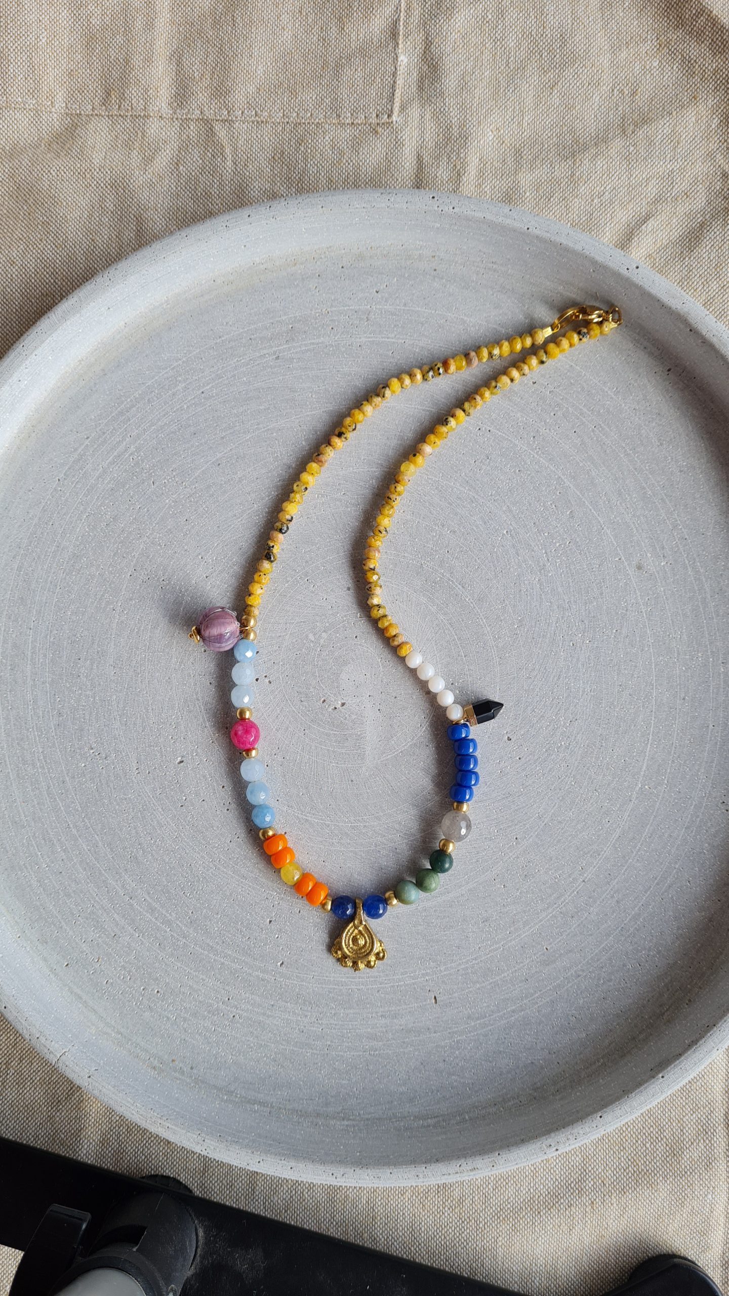 Collar artesanal de la colección Nepal elaborado con una cuidada mezcla de piedras naturales y colgante dorado de inspiración étnica. Cada pieza está montada a mano, buscando el equilibrio entre color, textura y forma.