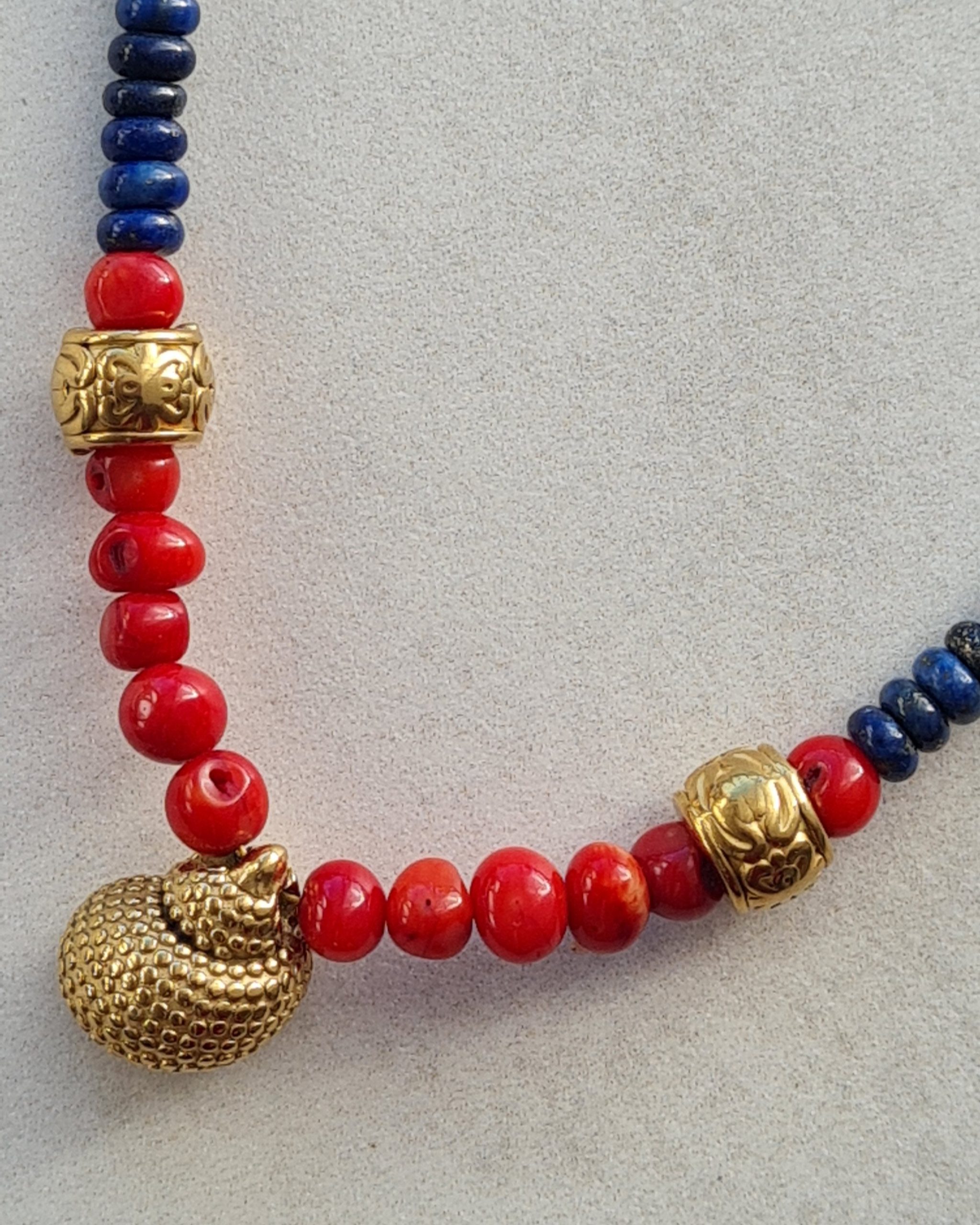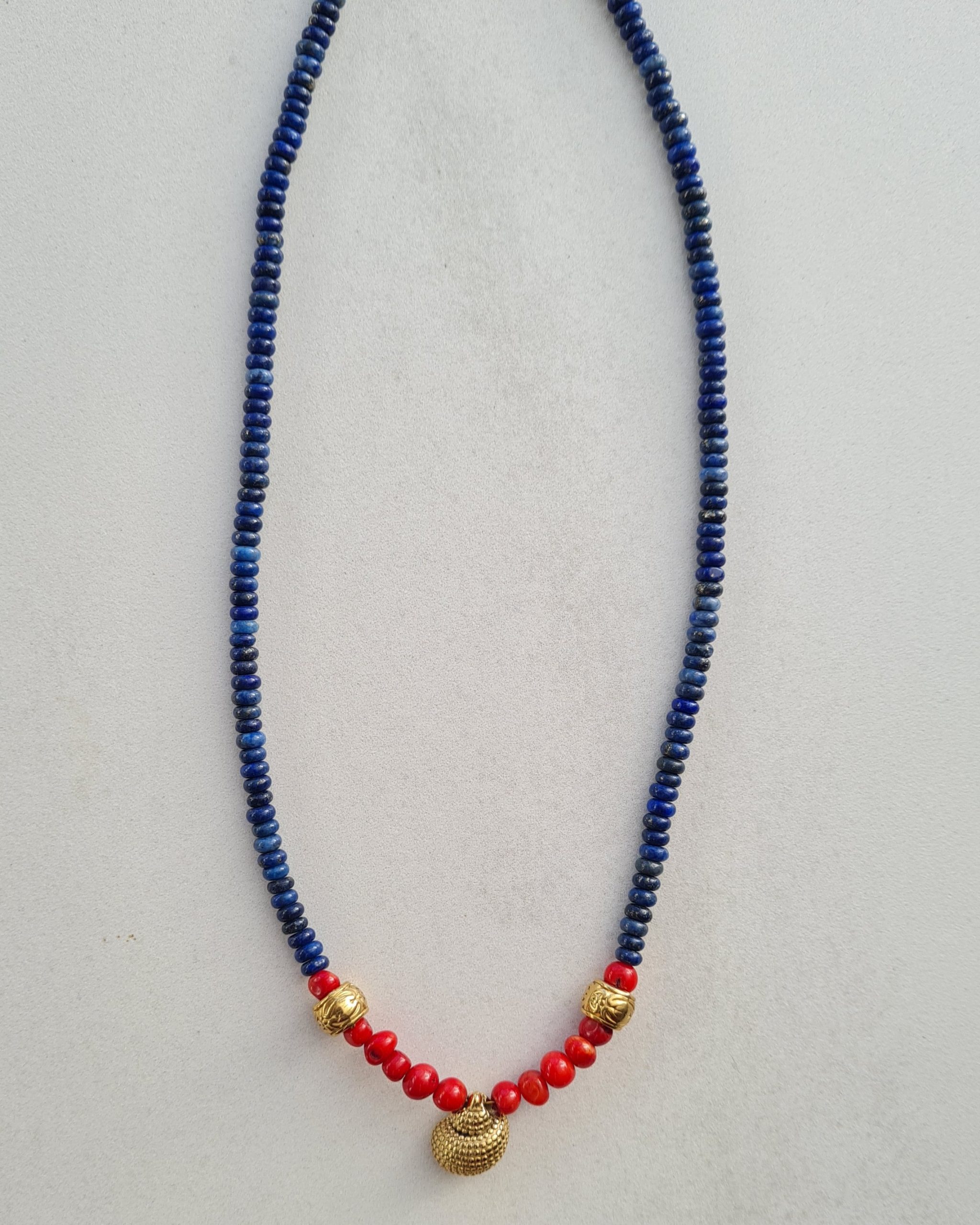 Collar artesanal de la colección Océano elaborado con piedras naturales cuidadosamente seleccionadas en tonos intensos, con colgante dorado protagonista que aporta carácter y elegancia. Inspirado en la profundidad del mar, es una pieza con presencia y fuerza visual.