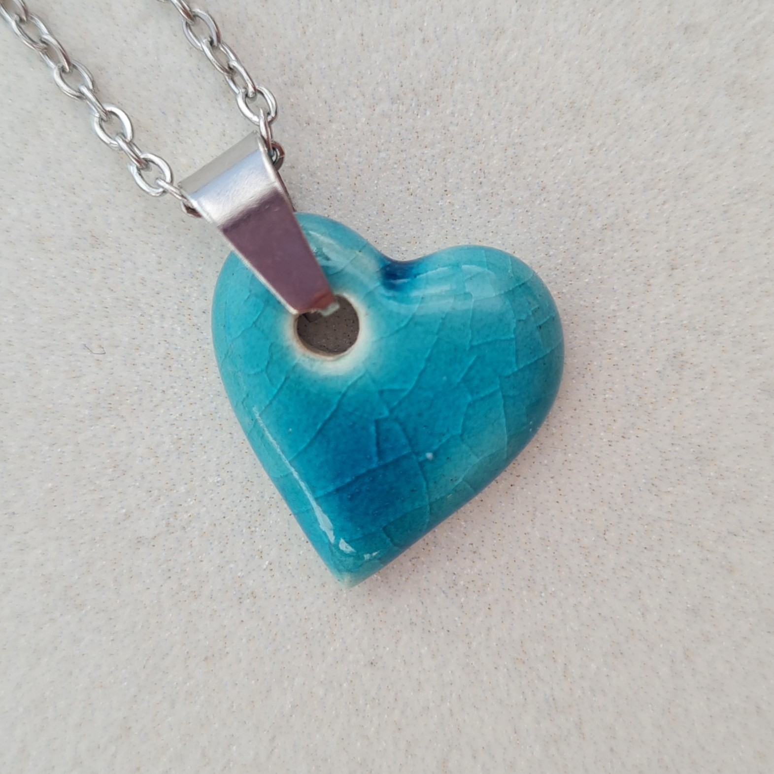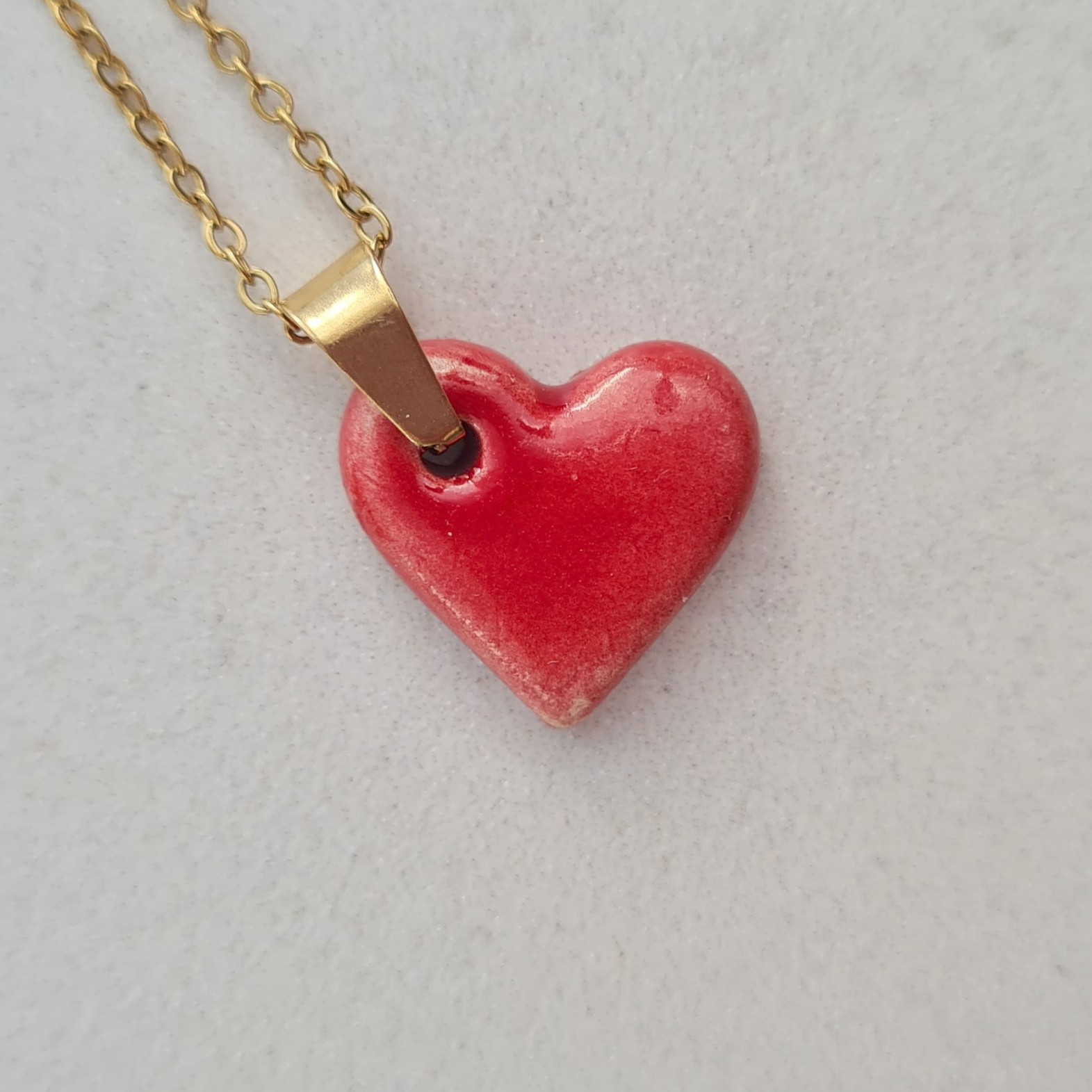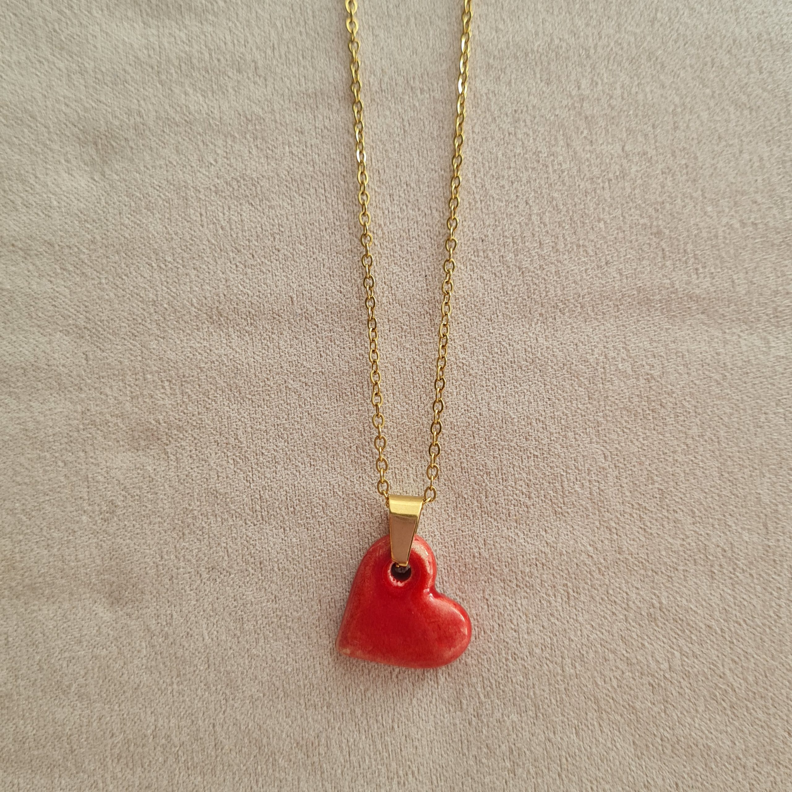 La gargantilla Caleta Corazón combina un colgante de cerámica esmaltada con forma de corazón hecho a mano y una cadena de acero en acabado dorado o plateado. Una pieza sencilla pero con personalidad, donde el color y el brillo del esmalte aportan luz al conjunto.