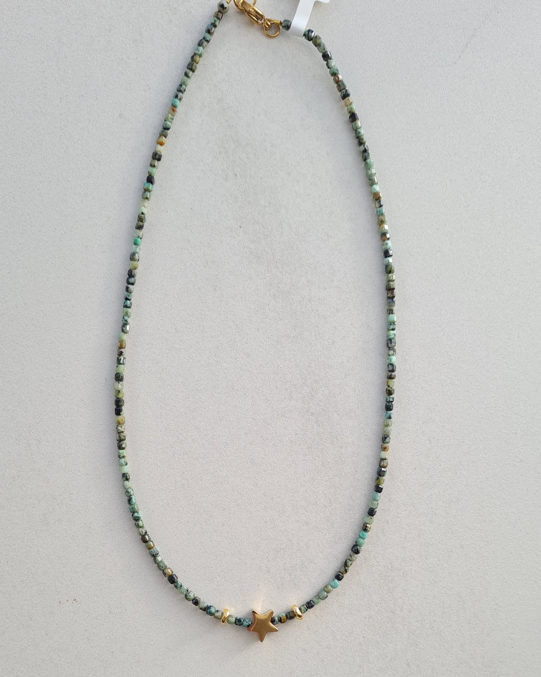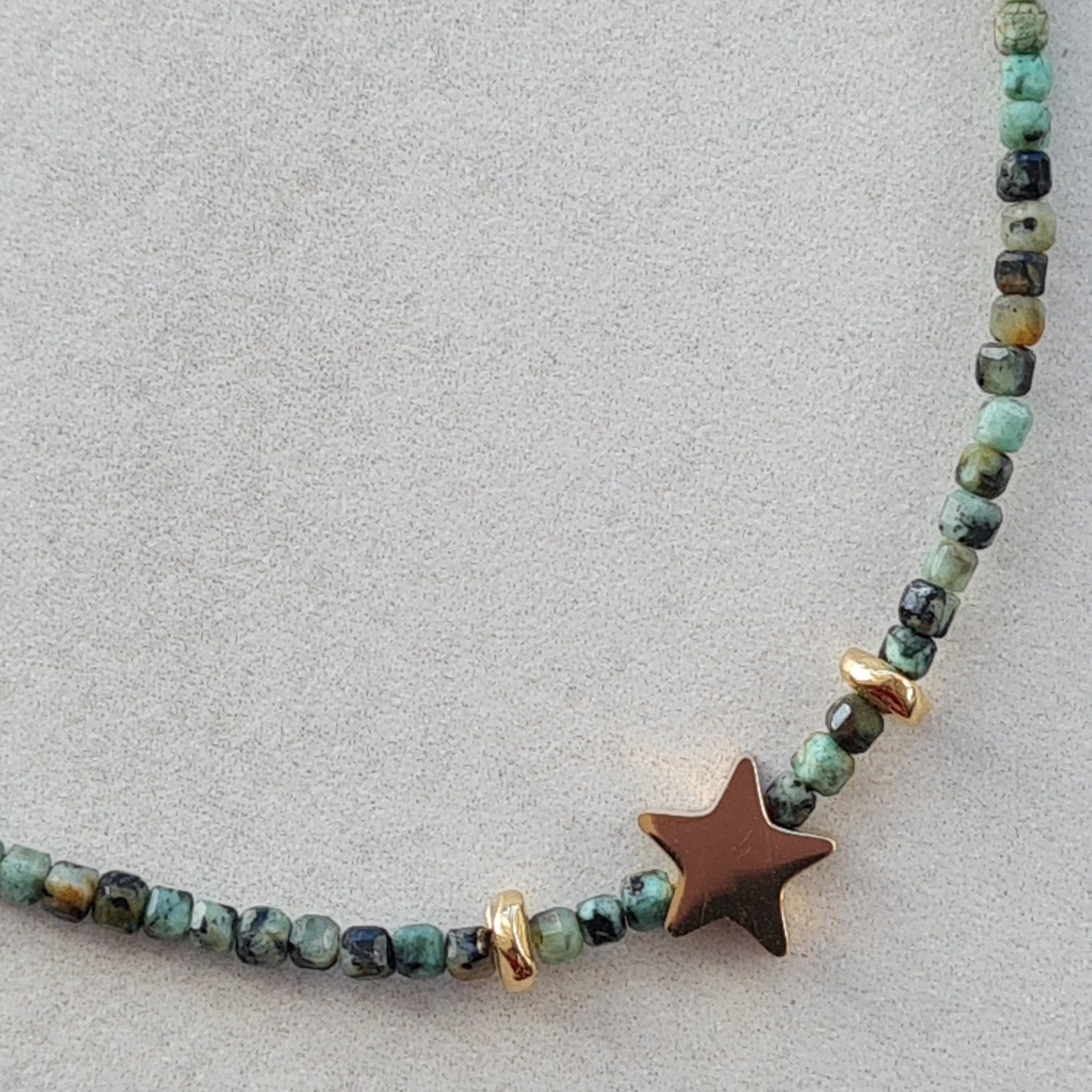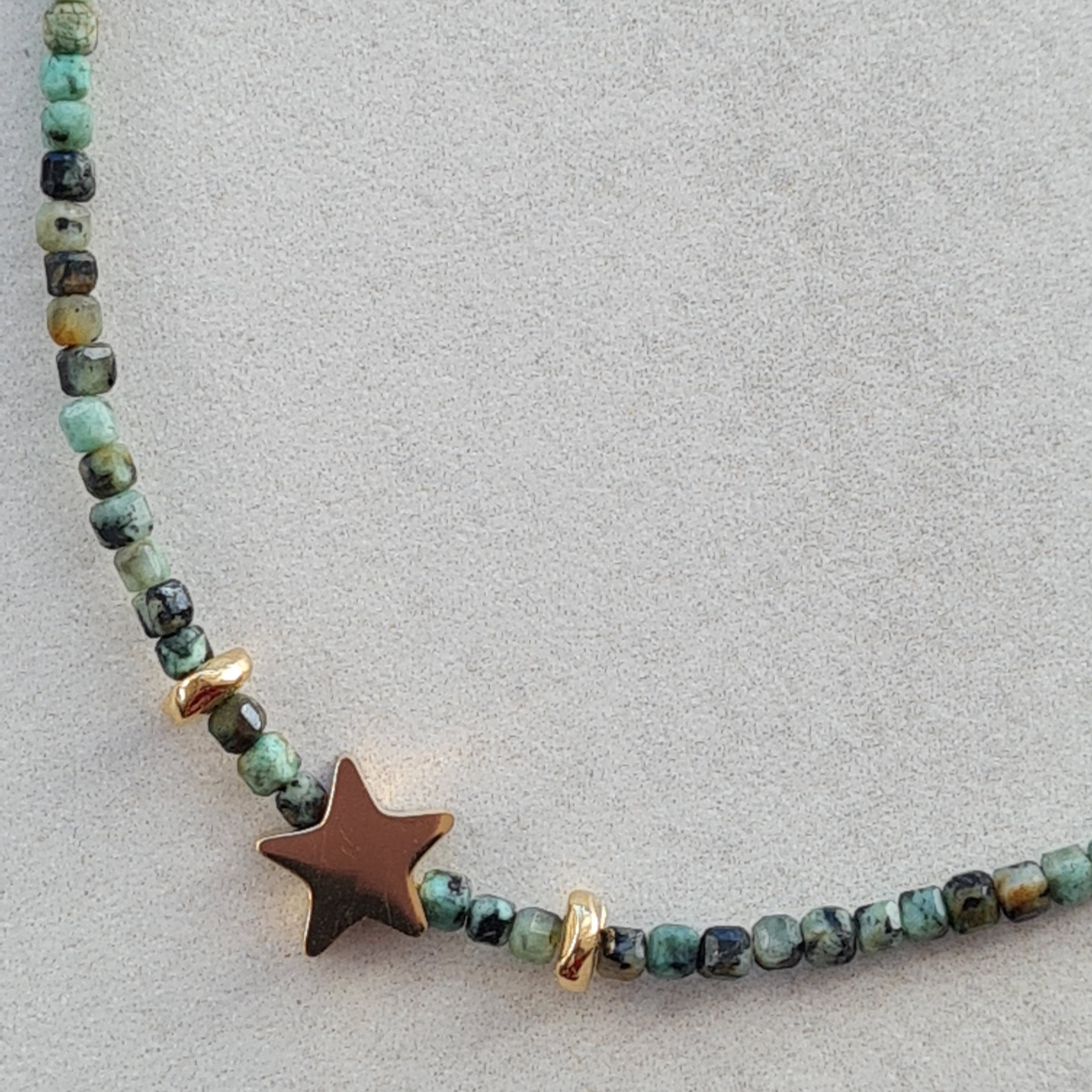 Destello es una pieza de la colección Lumiere elaborada con piedras naturales de jaspe turquesa africana facetadas en forma de tubo, de pequeño formato y un detalle luminoso en forma de estrella que aporta un punto de brillo controlado.
