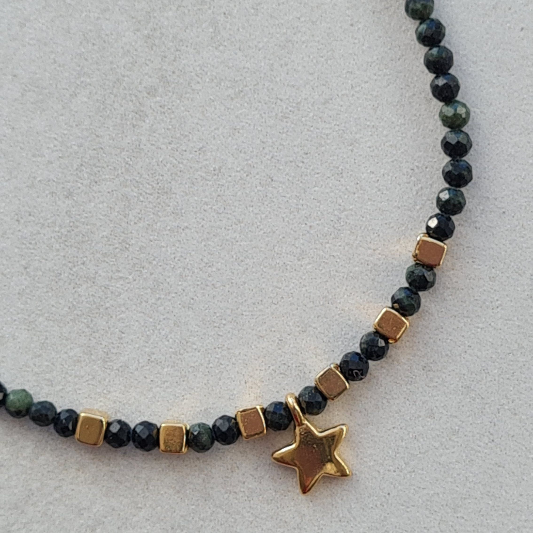 Noche es una gargantilla artesanal que combina profundidad y pequeños destellos de luz.
