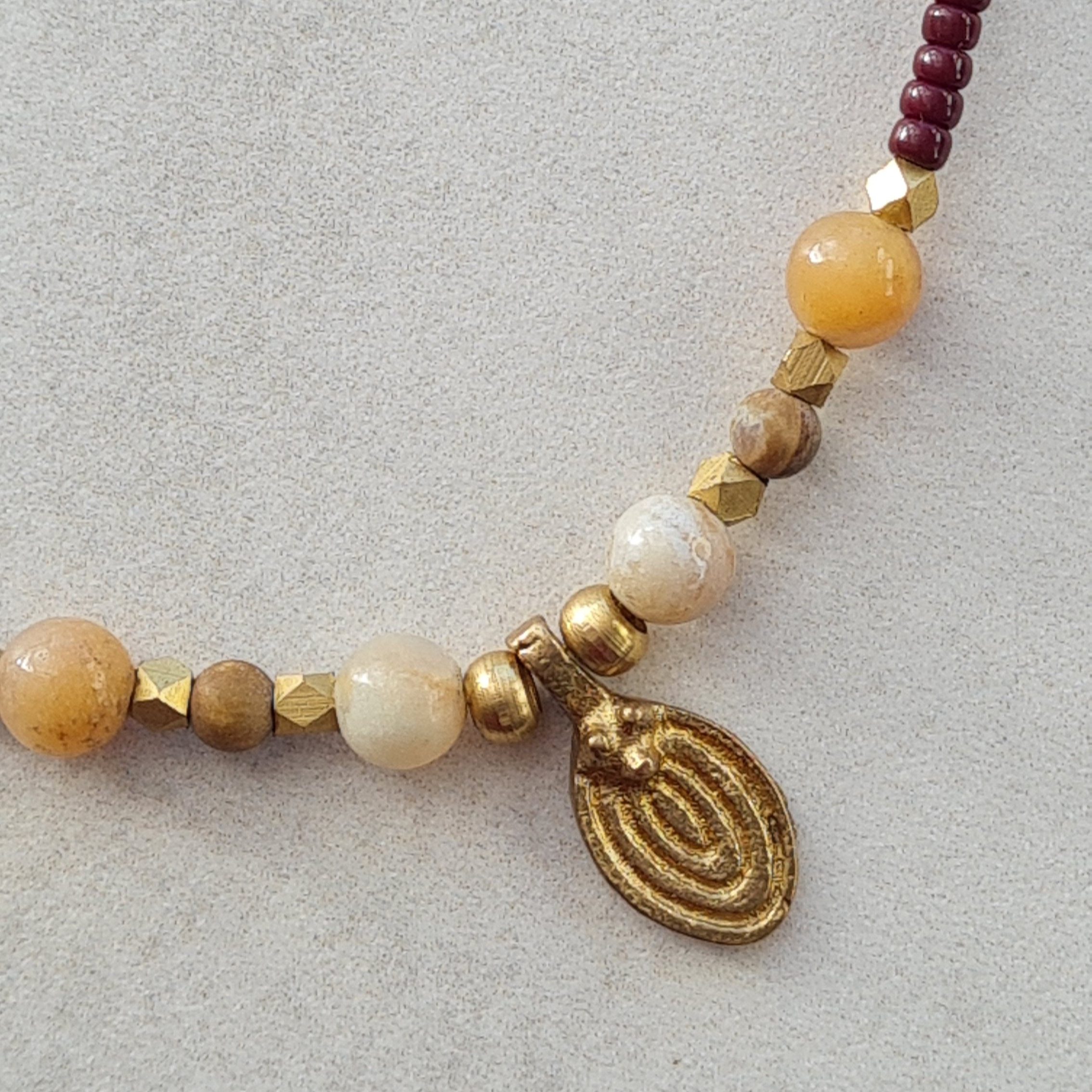 Collar artesanal de la colección Nepal elaborado con piedras naturales en tonos ligeramente más intensos, manteniendo una estructura ligera y bien equilibrada. El colgante dorado aporta contraste y define el diseño.na opción ideal para quienes buscan una pieza artesanal con personalidad contenida.