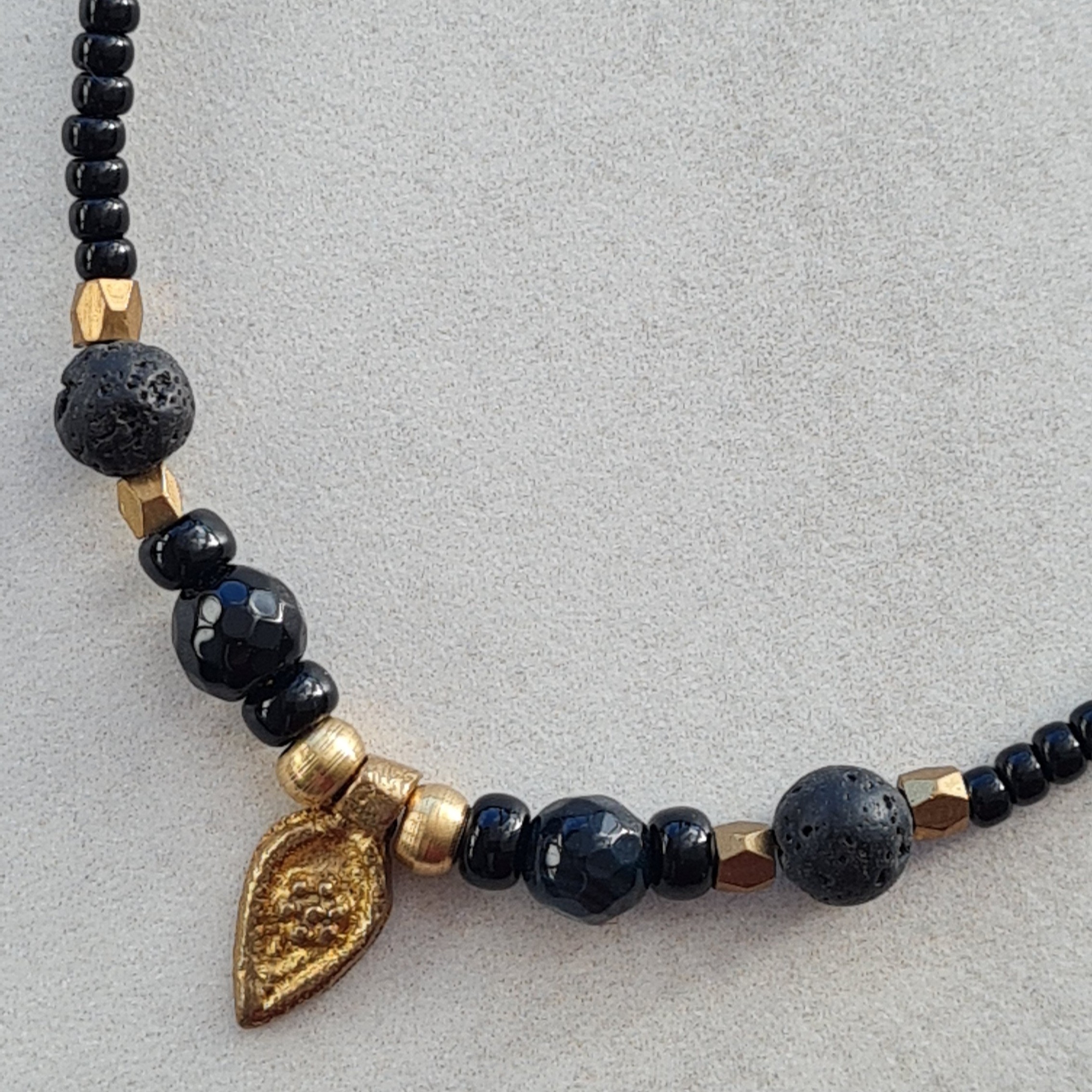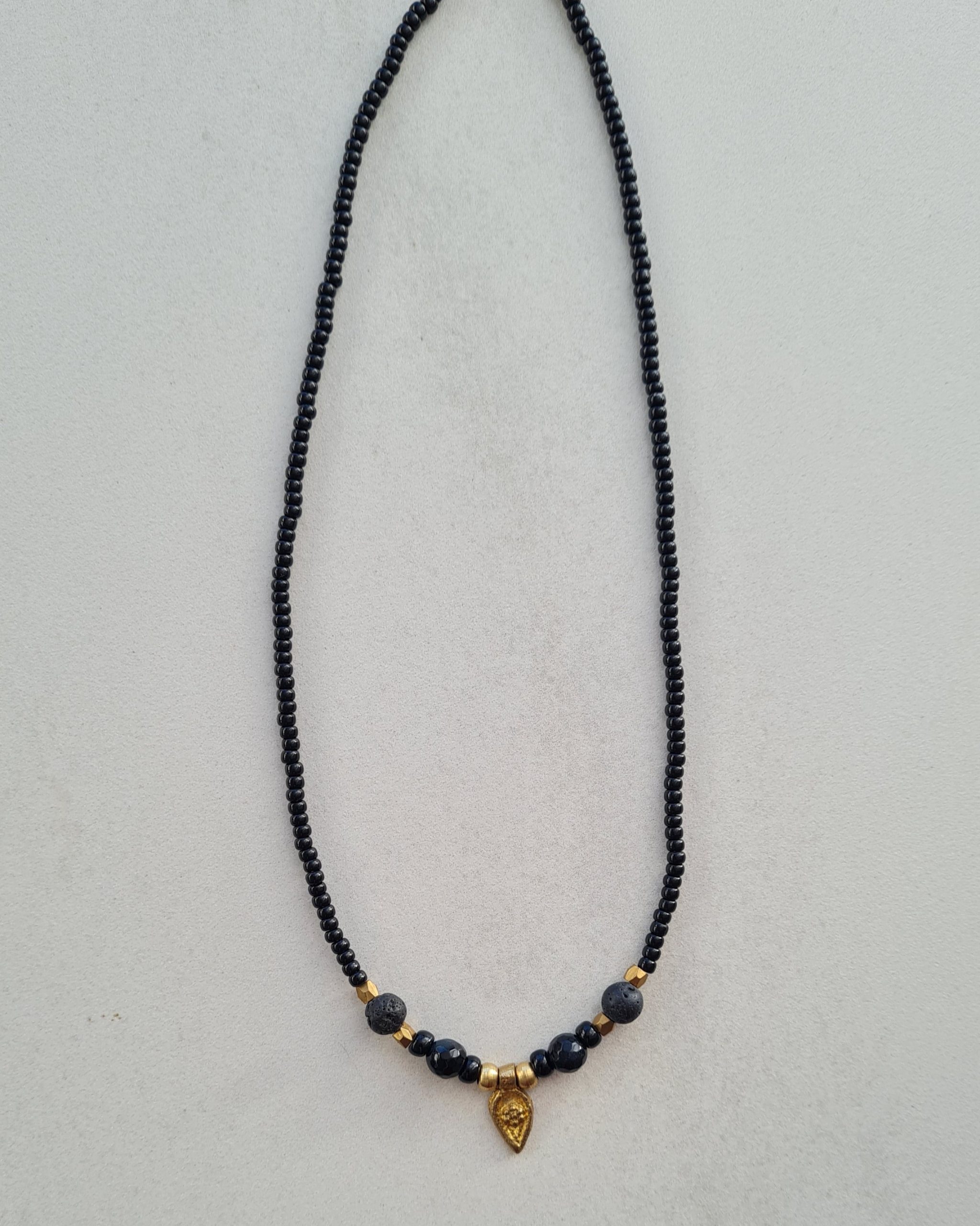 Collar artesanal de la colección Nepal Nira confeccionado con piezas de rocalla Miyuk, piedras naturales y colgante en latón, hacen una combinación equilibrada de tonos cálidos y neutros. Su diseño fluido destaca por la armonía entre materiales y forma.