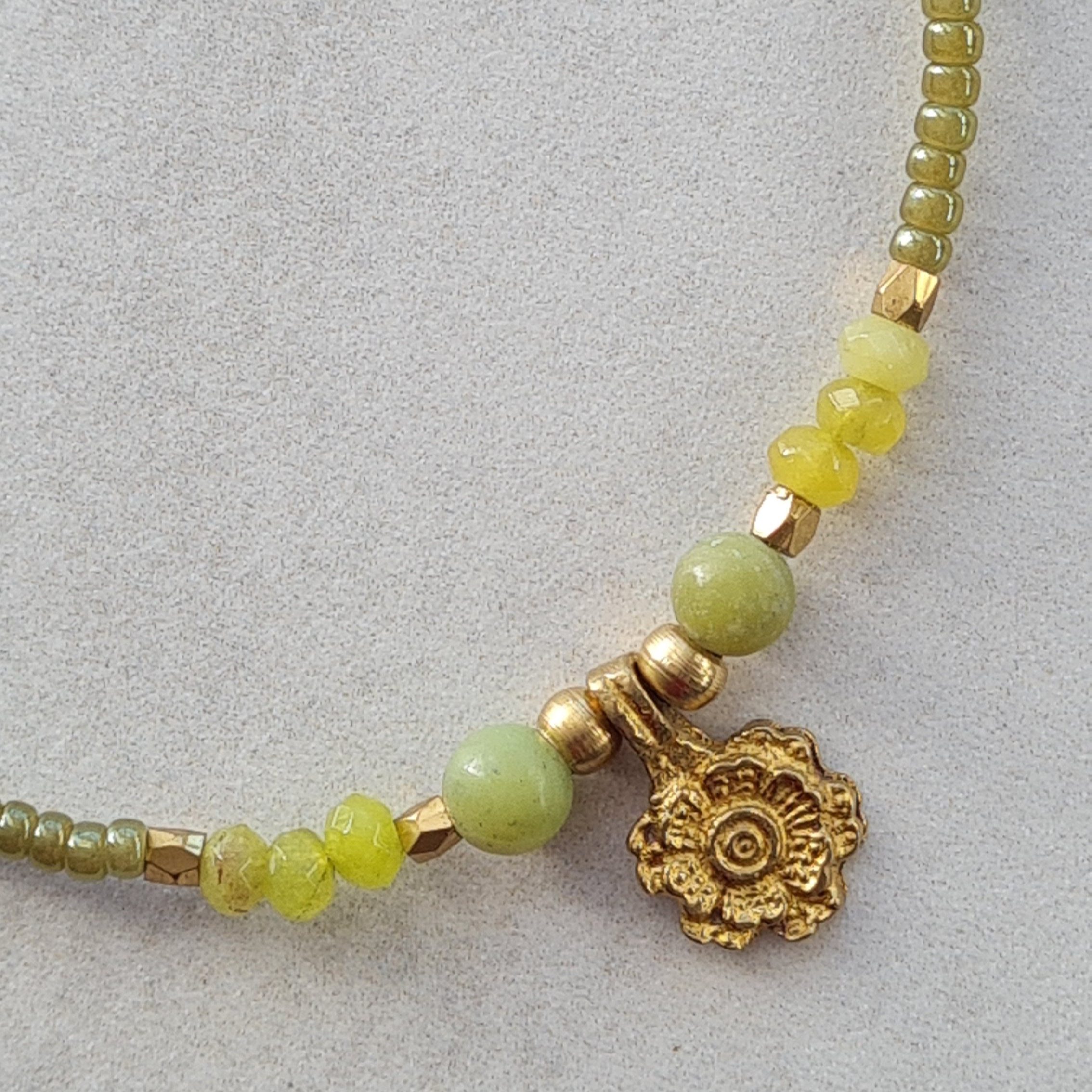 Collar artesanal de la colección Nepal realizado con rocalla Miyuki, piedras naturales y cristal cuidadosamente seleccionadas por su textura y color. La composición fluida y el colgante dorado crean una pieza elegante y fácil de combinar.